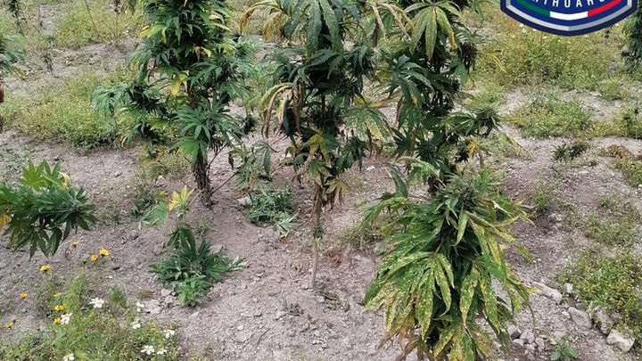 Elementos de la Agencia Estatal de Investigación, destruyeron un campamento de cuatro plantíos de marihuana, equipados con sistema de riego, en el Arroyo del Macho en el municipio de Carichí.