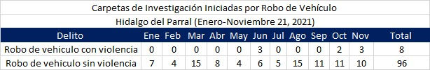 Cabe hacer mención que la estadística delictiva es permanente, en los once meses del año siempre ha estado presente el robo de vehículo. Tan solo En un corte hecho a los primeros días de noviembre la suma ya se establecía una sumativa anual a esa fecha de 104, es decir los latrocinios ocurren uno cada tres días.